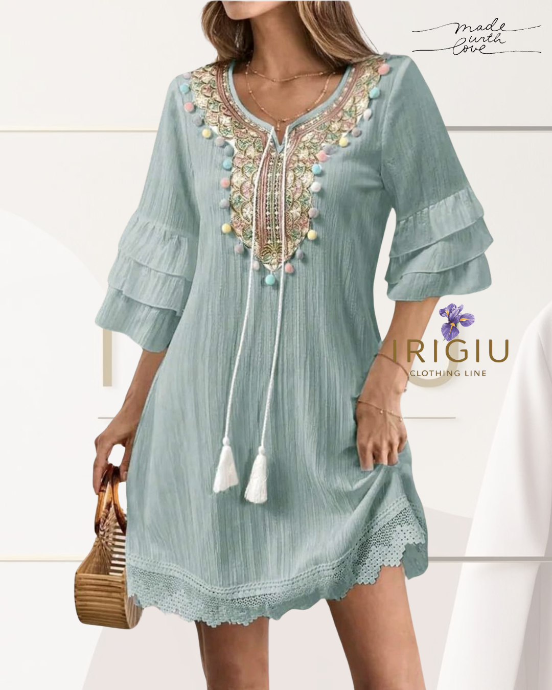L'abito Summer è perfetto per le tue giornate estive in spiaggia o in vacanza. Realizzato con uno scollo a V ricamato e arricchito da dettagli a nappine colorate, aggiunge un tocco di eleganza e vivacità. Le maniche a un terzo, arricciate, garantiscono comfort e stile, rendendo questo abito leggero e fresco, ideale per affrontare il caldo con raffinatezza.