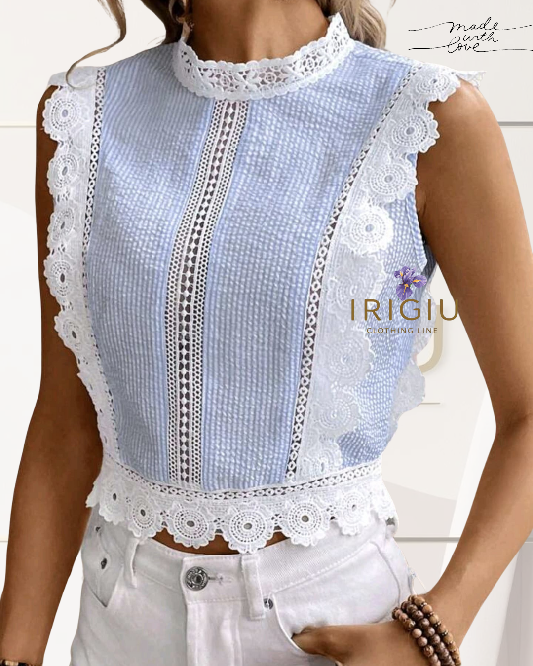 Questo top corto in cotone, arricchito da eleganti inserti in pizzo bianco, unisce comfort e raffinatezza. Il taglio corto valorizza la silhouette, rendendolo ideale per look estivi sofisticati e freschi. Perfetto da abbinare a pantaloni o gonne a vita alta per un outfit versatile e di classe.