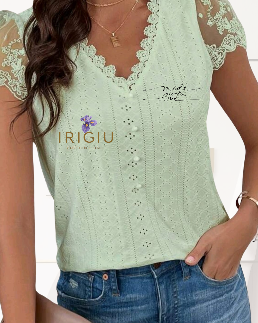 La maglietta estiva Francy unisce eleganza e leggerezza grazie al tessuto a maglia abbinato a maniche in velo, che garantiscono freschezza e comfort. Il raffinato scollo a V è impreziosito da ricami delicati e da piccoli bottoncini posizionati sotto, aggiungendo un tocco di sofisticata femminilità. Disponibile nei toni freschi del verde acqua, giallo paglierino e bianco, questa maglietta è ideale per chi cerca uno stile estivo versatile e curato nei dettagli.